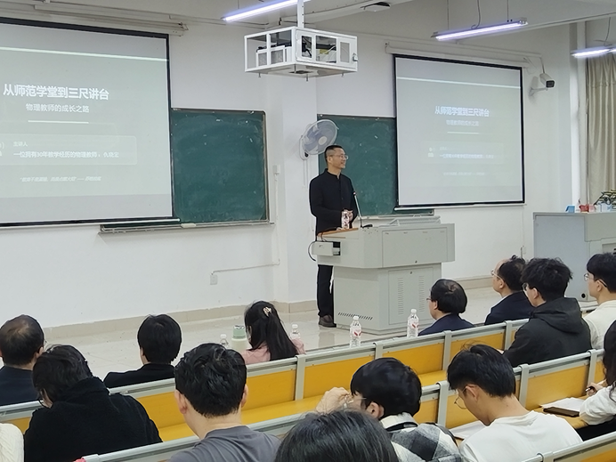 2026年4月7日,衡阳市第一中学物理教师、中学高级教师仇晓宏老师应邀来到我院,为2022级物理学专业全体同学带来了一场题为《从师范学堂到三尺讲台——物理教师的成长之路》的研习专题讲座。讲座由学院副院长凌晓辉教授主持,原副校长张登玉教授、物电学院唐世清教授、部分研习指导老师以及2022级物理学专业全体同学共同在星瀚楼南112教室聆听了这场精彩的讲座。